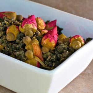 Delicate oolong tea with a clear orange-brown colour.