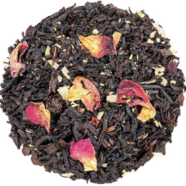 Ingredients: Black tea, currants, coconut chips, rose blossoms, natural flavour.